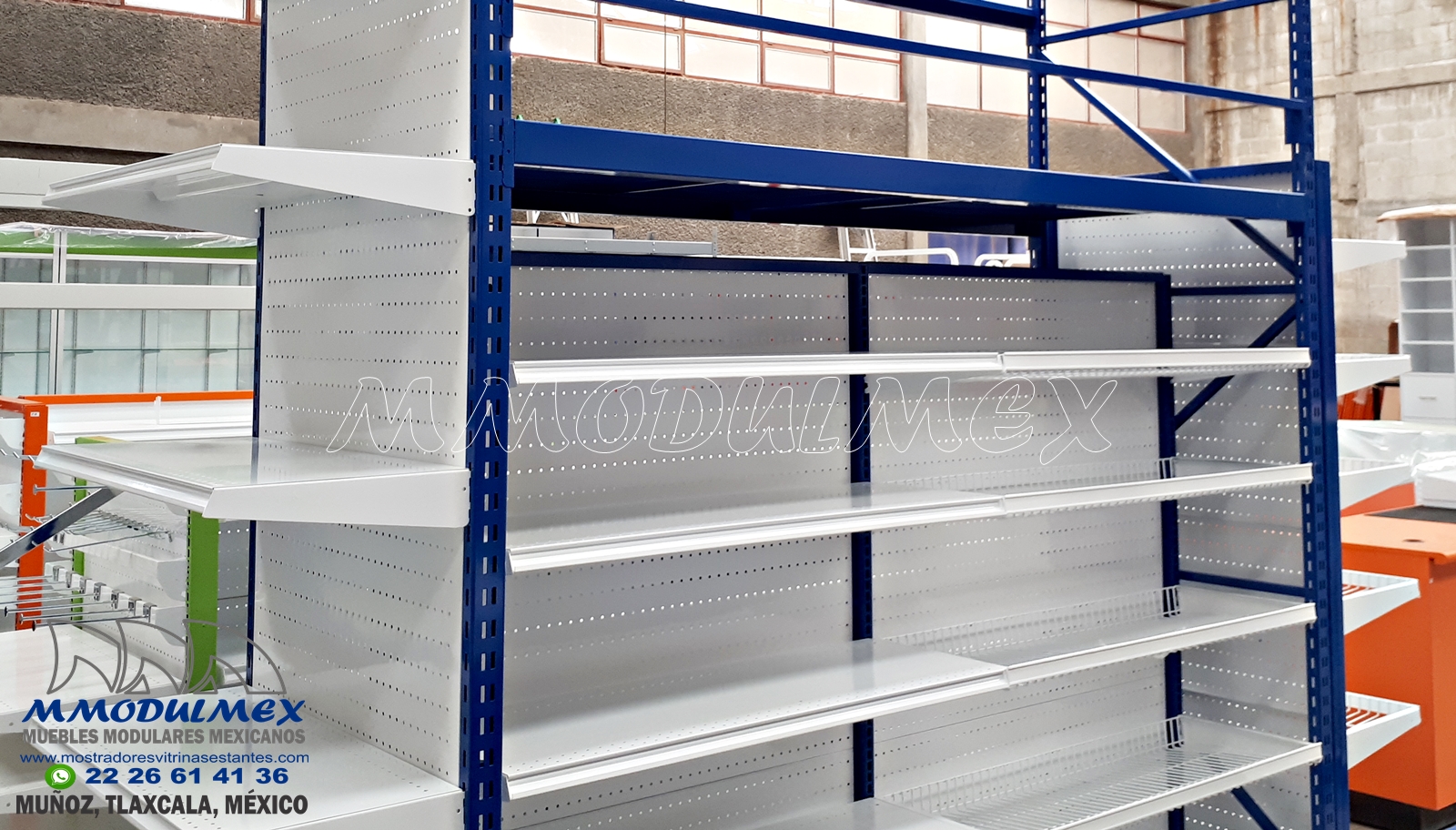 Fabricamos también Góndolas y racks metálicos de doble propósito... (exhibición y almacenaje), formada por góndolas metálicas centrales y racks de carga semipesada o de carga industrial que dependerá de la cantidad de producto se quiera almacenar en la parte superior... En las cabeceras se pueden colocar entrepaños directamente al marco del rack o puede colocarse la cabecera normal con entrepaños lisos o de alambre. La diferencia entre una u otra opción en las cabeceras, es la capacidad de carga del entrepaño....
