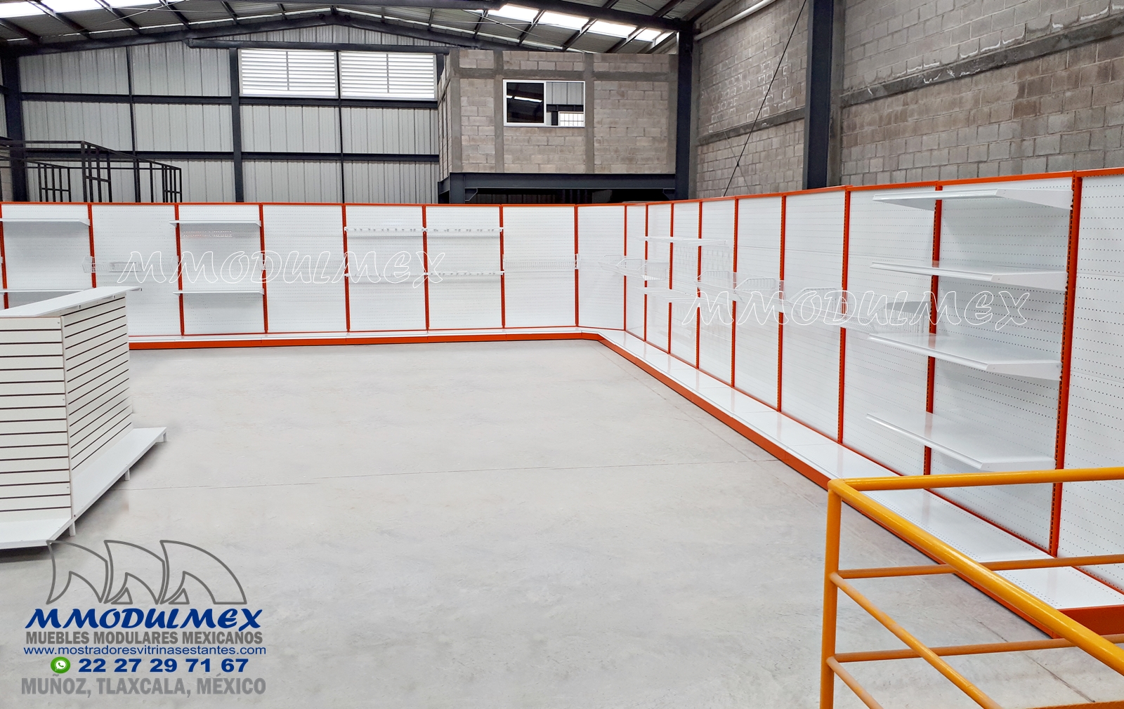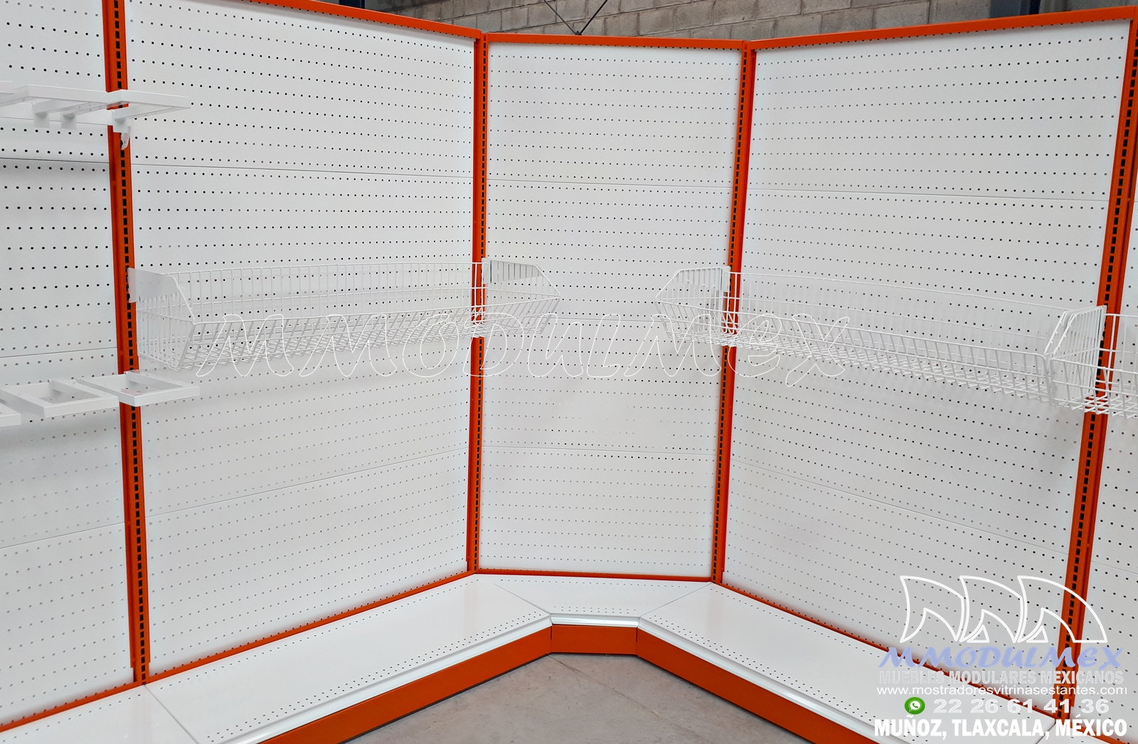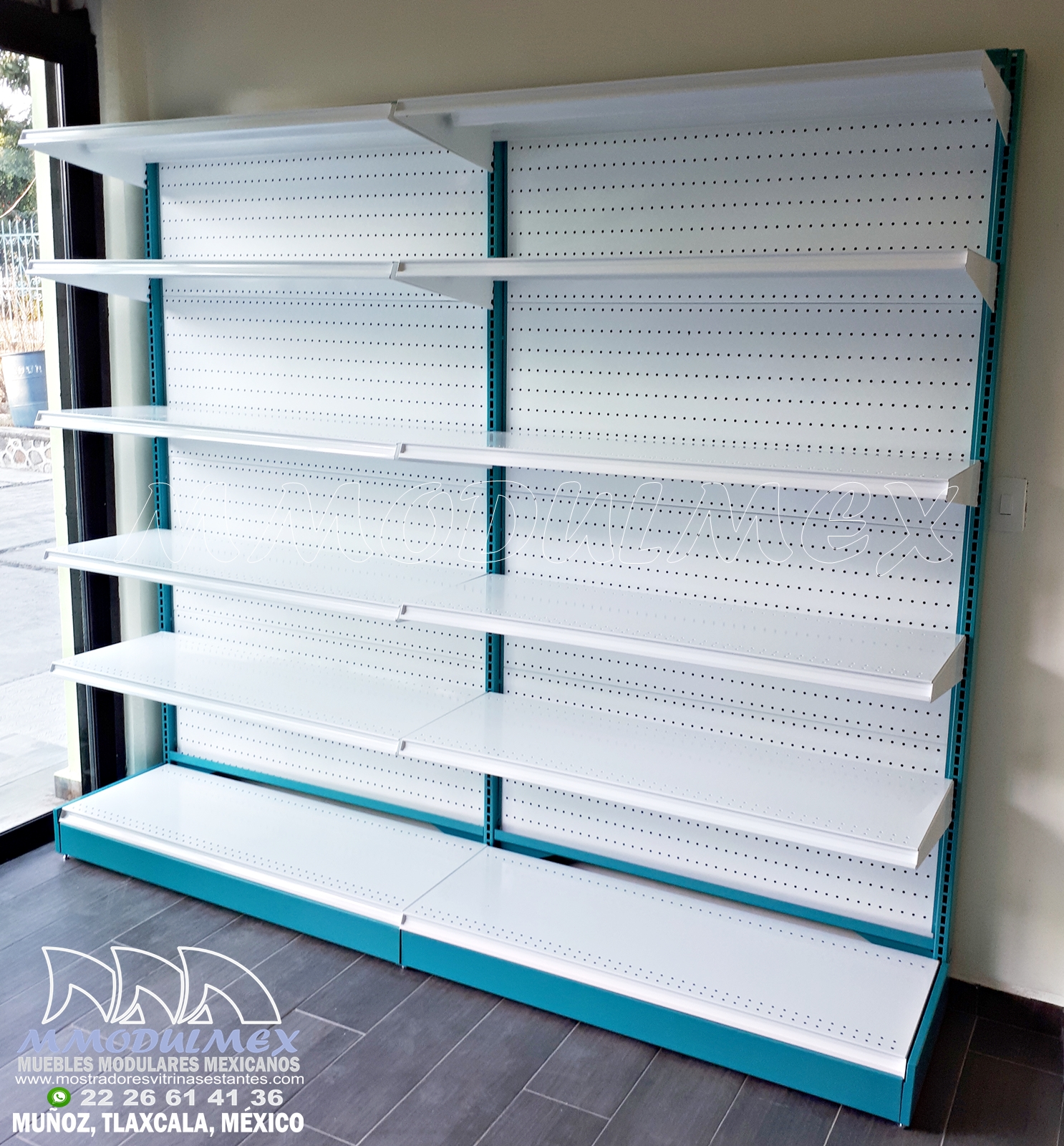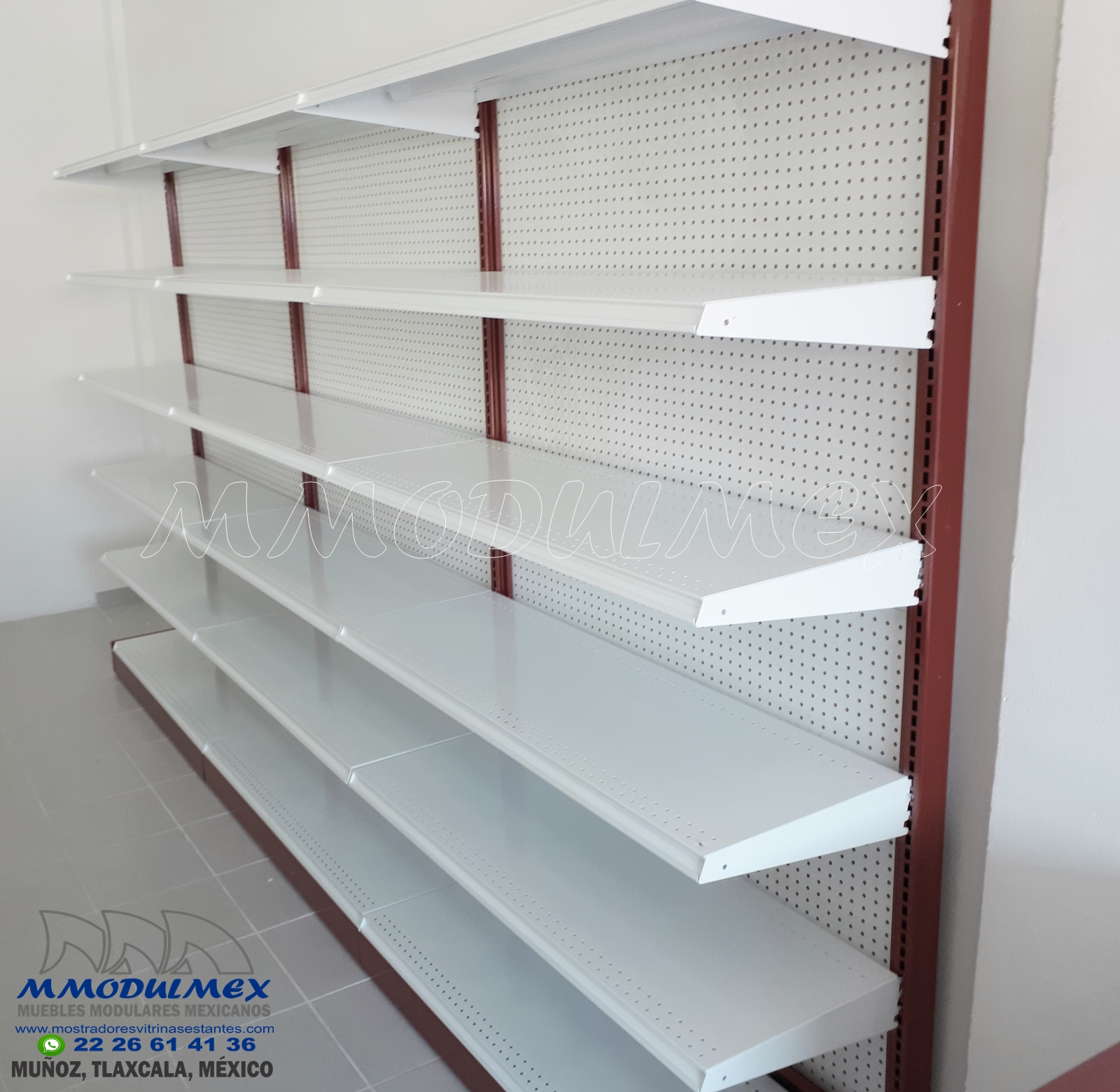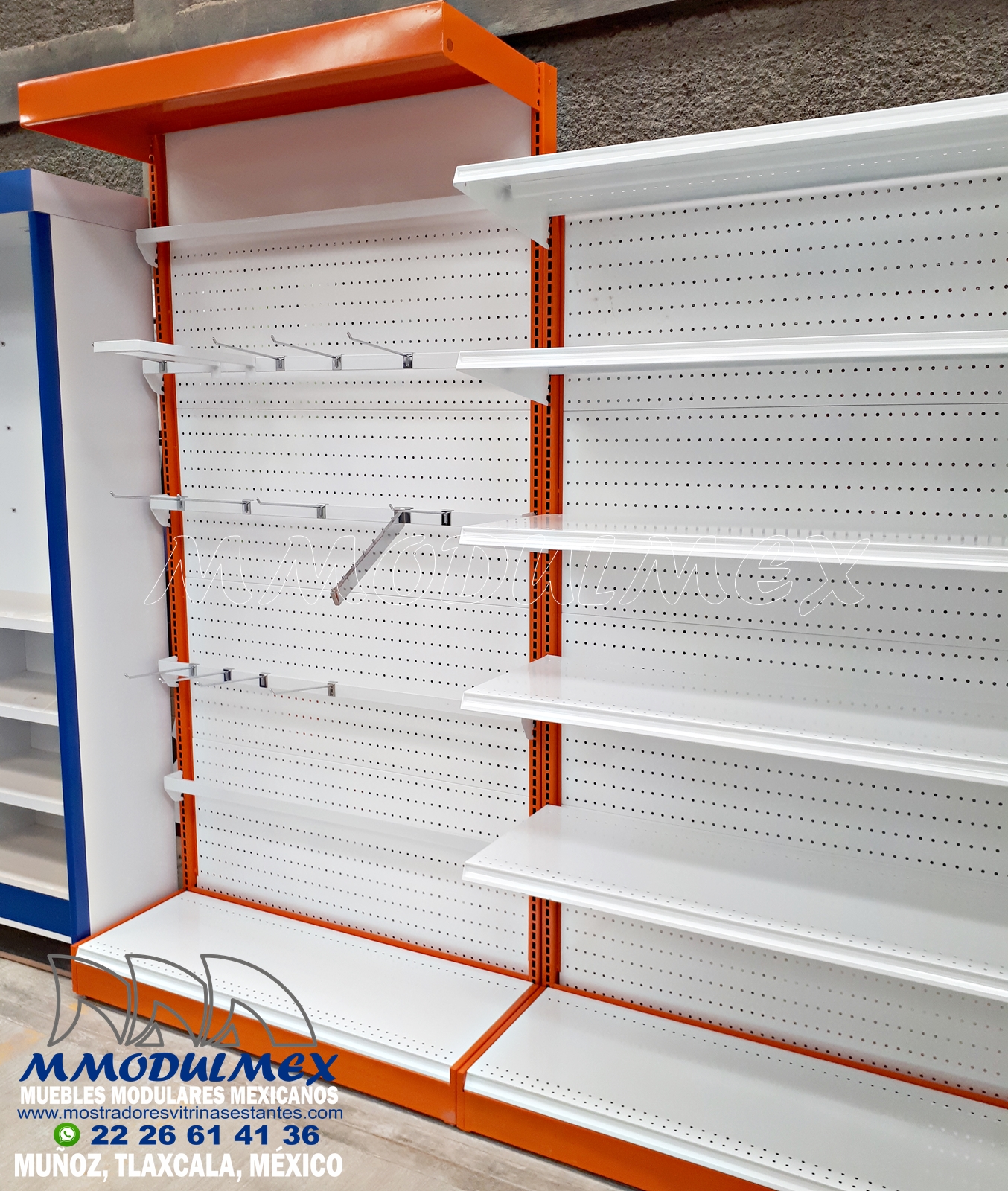 Con esas medidas se pueden hacer infinidad de configuraciones de medidas; pero también podemos fabricarlas a la medida que los clientes necesitan. En las divisiones o respaldos, también tenemos varias opciones para satisfacer las necesidades de exhibición de los clientes: Panel metálico liso; perforado metálico, perfocel de madera, panel ranurado o exhibipanel... todos ellos en las medidas y colores que el cliente solicita.