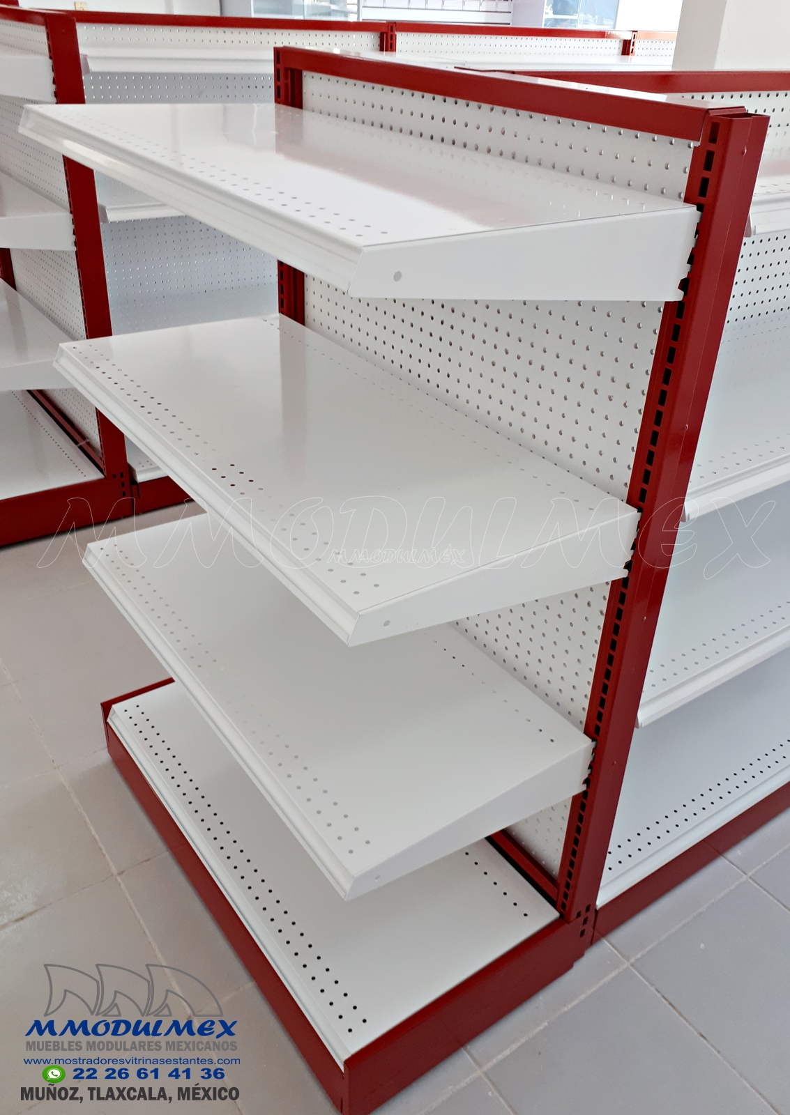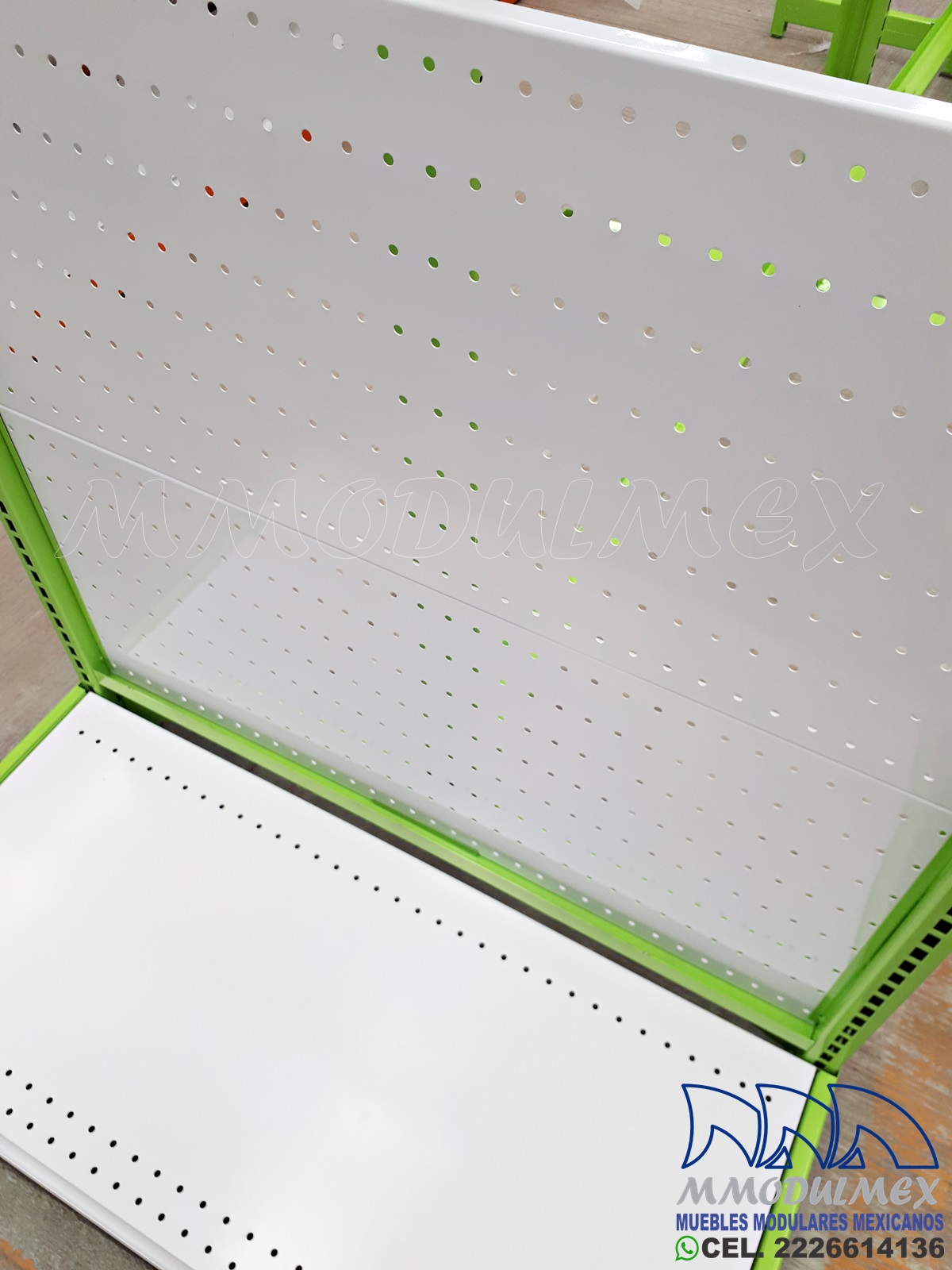 Con esas medidas se pueden hacer infinidad de configuraciones de medidas; pero también podemos fabricarlas a la medida que los clientes necesitan. En las divisiones o respaldos, también tenemos varias opciones para satisfacer las necesidades de exhibición de los clientes: Panel metálico liso; perforado metálico, perfocel de madera, panel ranurado o exhibipanel... todos ellos en las medidas y colores que el cliente solicita.